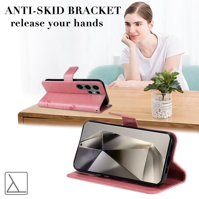Θήκη τηλεφώνου Samsung Galaxy S25 Ultra 5G από δέρμα με σχέδιο αναγλύφου δέντρου & γάτας (Ροζ)