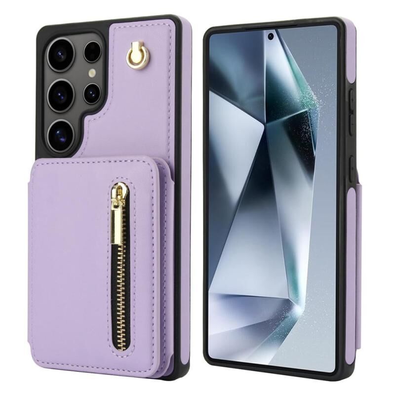 Θήκη κινητού τηλεφώνου Samsung Galaxy S25 Ultra 5G YM006 με υφή δέρματος, φερμουάρ και τσέπη για κάρτες, με διπλό κορδόνι (ανοιχτό μωβ)
