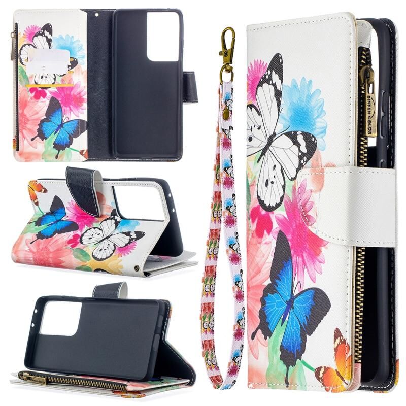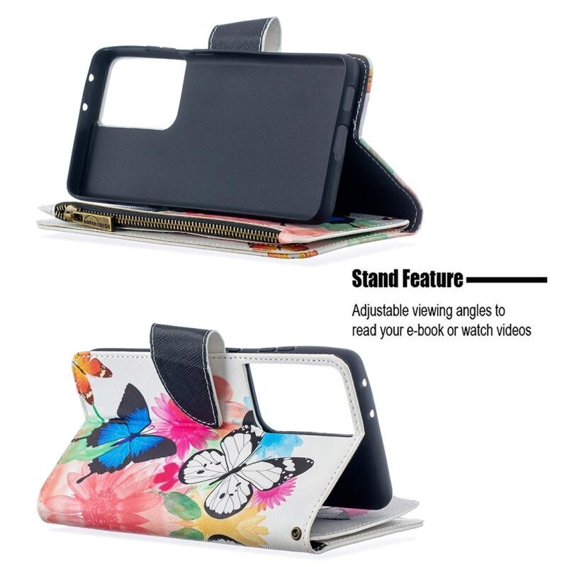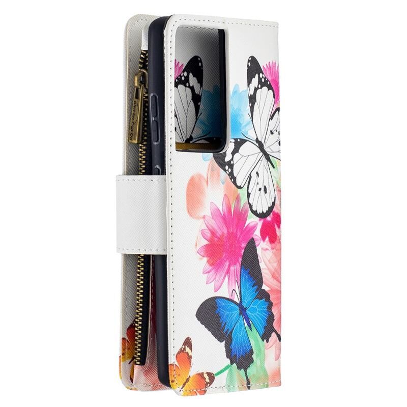 Θήκη δέρματος οριζόντιας αναδίπλωσης με φερμουάρ για Samsung Galaxy S30 Ultra με έγχρωμο σχέδιο (Δύο Πεταλούδες), με βάση & υποδοχές καρτών & πορτοφόλι. (Κόκκινο)