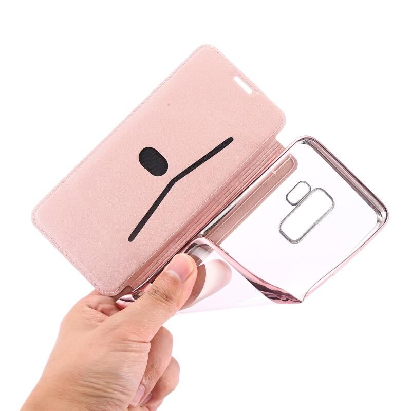 Θήκη δέρματος οριζόντιας αναδίπλωσης PU + TPU με επιμετάλλωση μπρούτζου για Samsung Galaxy S9+ με βάση & υποδοχή κάρτας (Ροζ-Μωβ)