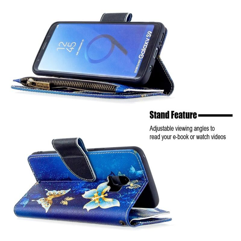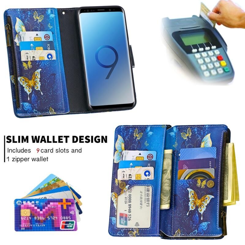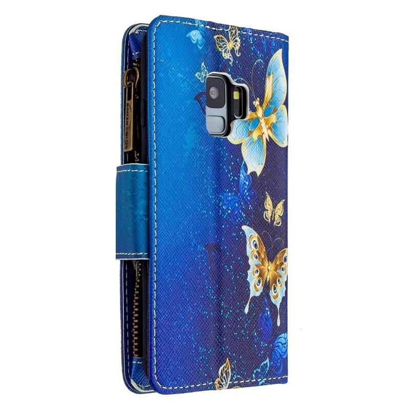 Θήκη Samsung Galaxy S9 Δερμάτινη Οριζόντια με Φερμουάρ, Σχέδιο Ζωγραφικής σε Χρώματα, με Θήκη & Θήκες Καρτών & Πορτοφόλι (Μωβ Πεταλούδα)
