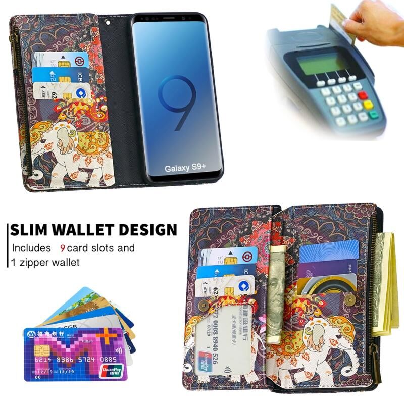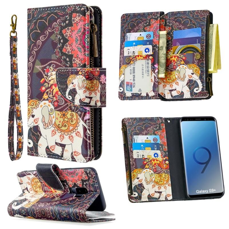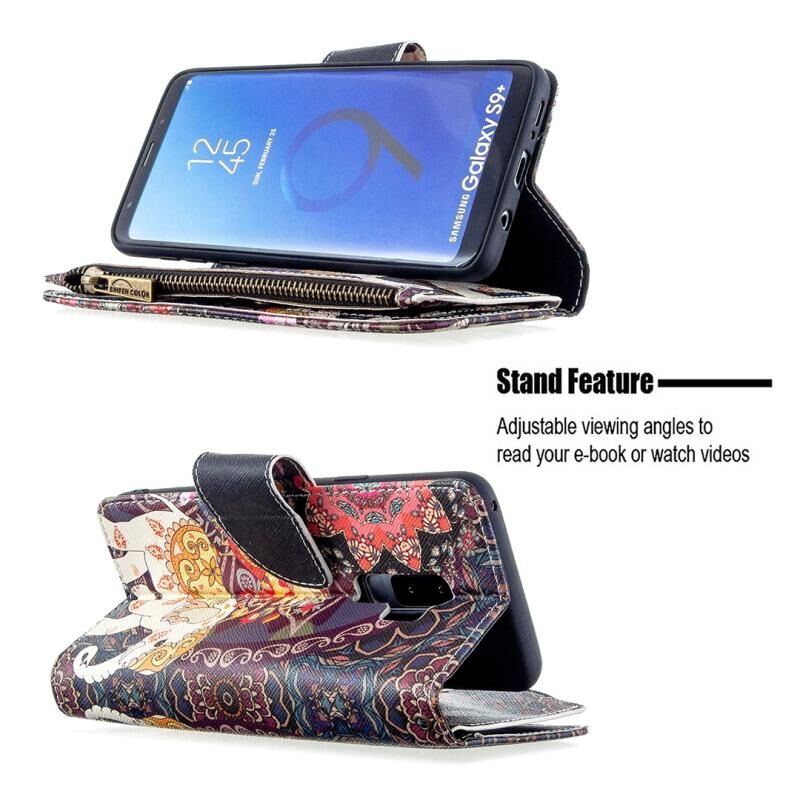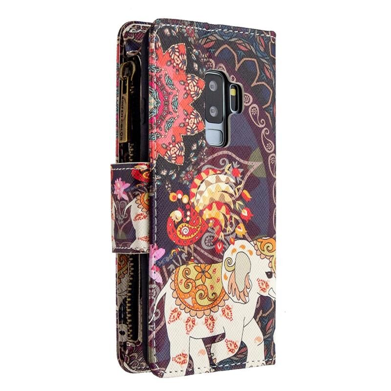 Θήκη Samsung Galaxy S9 Plus Δερμάτινη Οριζόντια με Φερμουάρ, Σχέδιο με Χρώματα και Λουλούδια-Ελέφαντες, με Θήκη και Θήκες για Κάρτες & Πορτοφόλι. (Κόκκινο)
