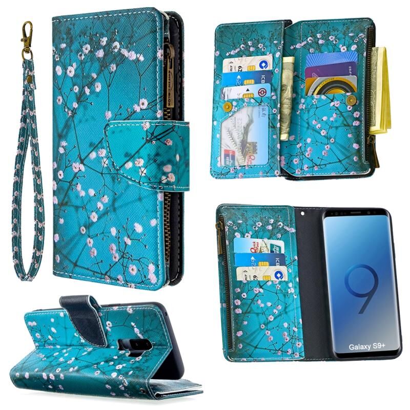 Θήκη δέρματος οριζόντιας αναδίπλωσης με φερμουάρ για Samsung Galaxy S9 Plus με έγχρωμο σχέδιο, θήκη και υποδοχές καρτών & πορτοφόλι (Λουλούδι Δαμασκηνιάς)
