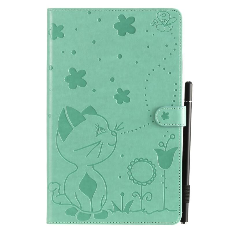 Για Samsung Galaxy Tab A10.1 (2019) T510 Θήκη δερμάτινη οριζόντια, αναδιπλούμενη, με σχέδιο ανάγλυφου Cat Bee, αντικραδασμική, προστατευτική για tablet PC με βάση στήριξης, θήκες για κάρτες, πορτοφόλι και υποδοχή για στυλό (Πράσινο)