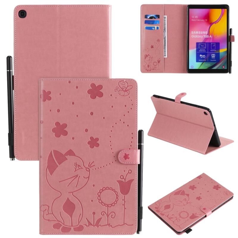 Για Samsung Galaxy Tab A10.1 (2019) T510 Θήκη δερμάτινη οριζόντια, αναδιπλούμενη, με σχέδιο ανάγλυφου Cat Bee, αντικραδασμική, προστατευτική για tablet PC με βάση στήριξης, θήκες για κάρτες, πορτοφόλι και υποδοχή για στυλό (Πράσινο)
