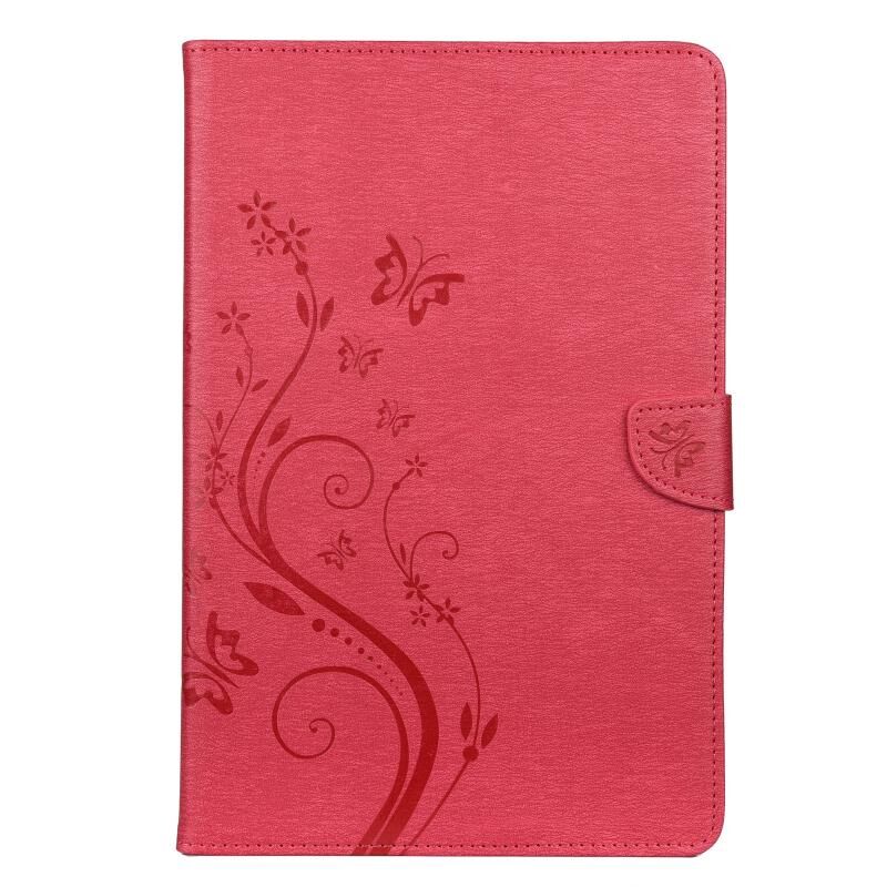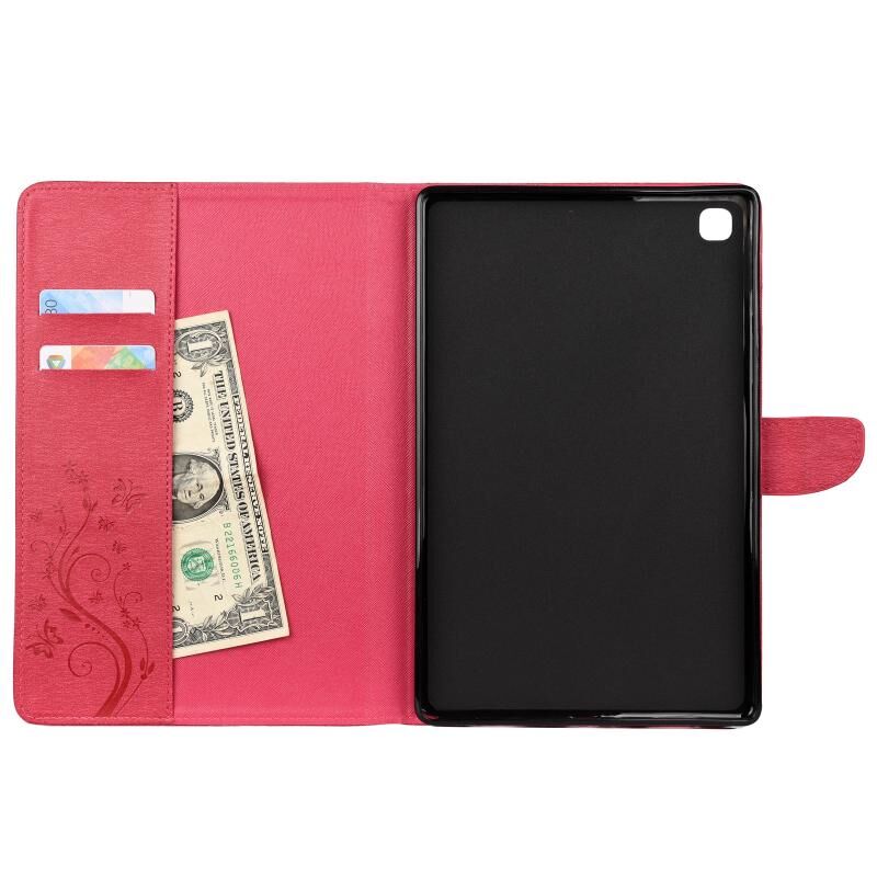 Θήκη Samsung Galaxy Tab A7 10.4 (2020) T505, δερμάτινη οριζόντια με σχέδιο ανάγλυφου πεταλούδας και λουλουδιών, με βάση στήριξης & θήκες καρτών & πορτοφόλι (Ματζέντα)