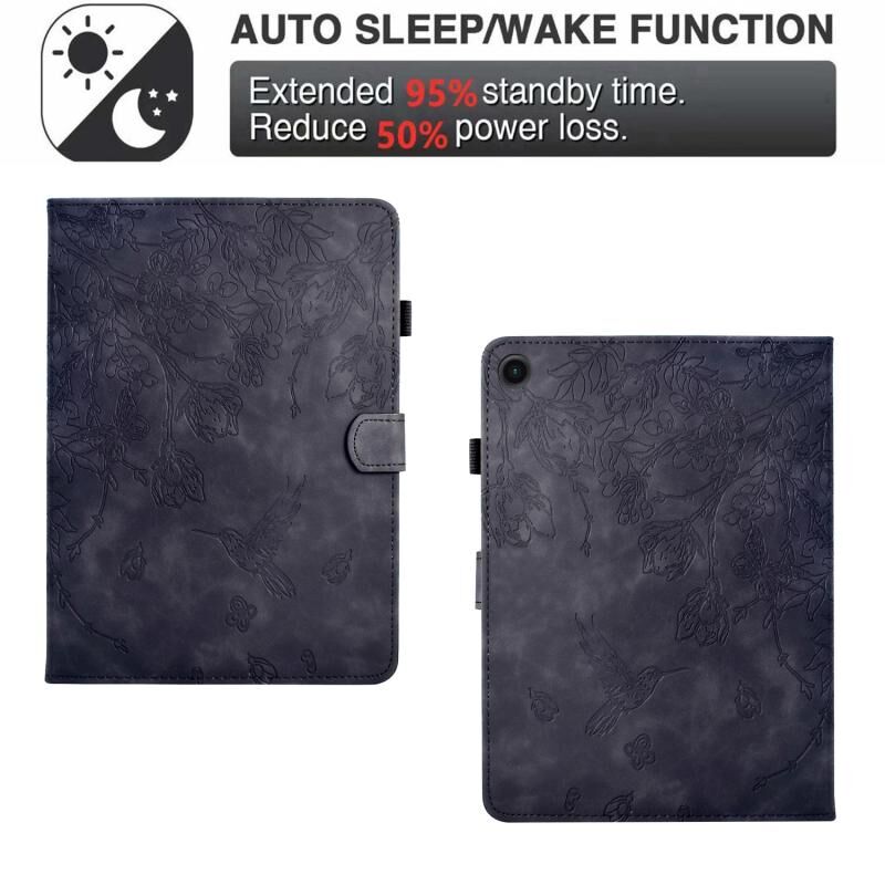 Θήκη για Samsung Galaxy Tab A9+ με ανάγλυφα σχέδια λουλουδιών και πουλιών, από έξυπνο δέρμα (Καφέ)