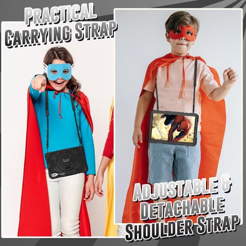 6. Detachable Shoulder Strap: The adjustable hand strap provides easy and comfortable grip, a must-have feature when you are presenting your tablet to others. The detachable and adjustable shoulder strap can help you carry your tablet more safely while hiking, traveling and other outdoor activities. This can also be used to secure your tablet to the car seat.