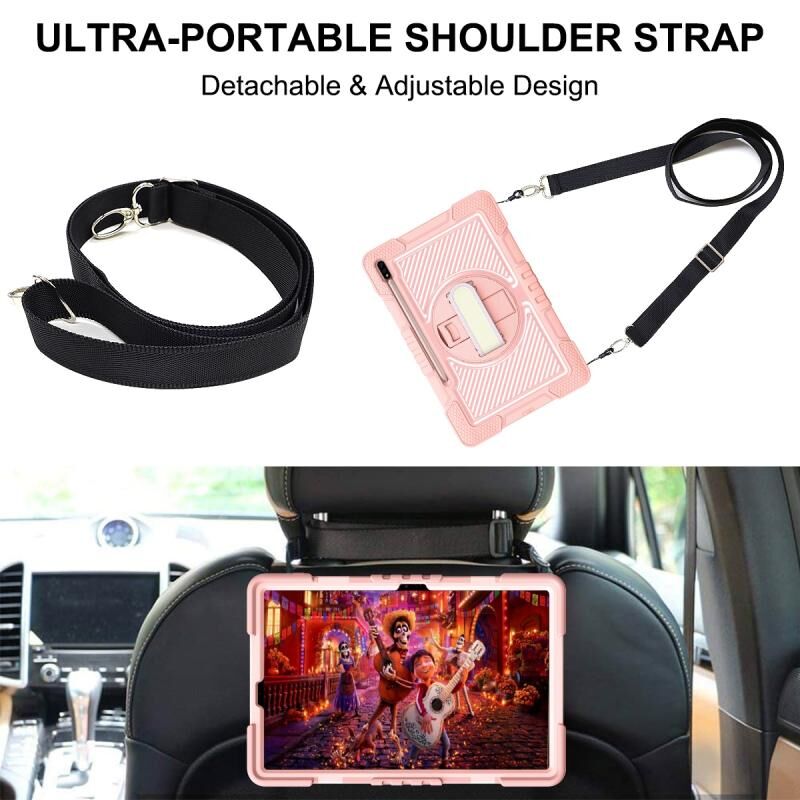 For Samsung Galaxy Tab S7 FE T730 / T735 / Tab S7+ T970 / T975 360 Degree Rotation Contrast Color Shockproof Silicone + PC Case with Holder & Hand Grip Strap & Shoulder Strap(Rose Gold)