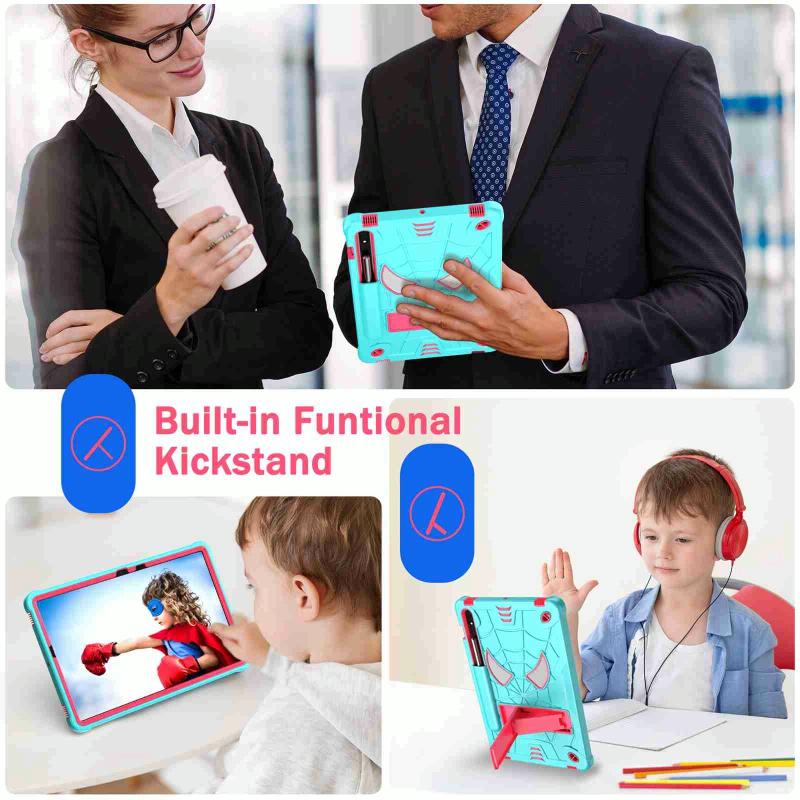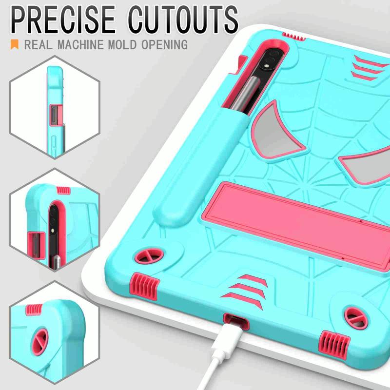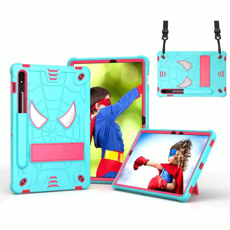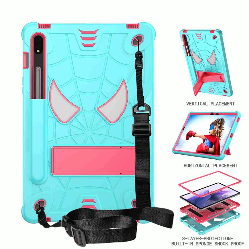 Θήκη ταμπλέτας υβριδικού υλικού σιλικόνης και πολυανθρακικού για Samsung Galaxy Tab S7 / S8 με υφή αράχνης και λουρί ώμου (Μέντα πράσινο + Ροζ κόκκινο)