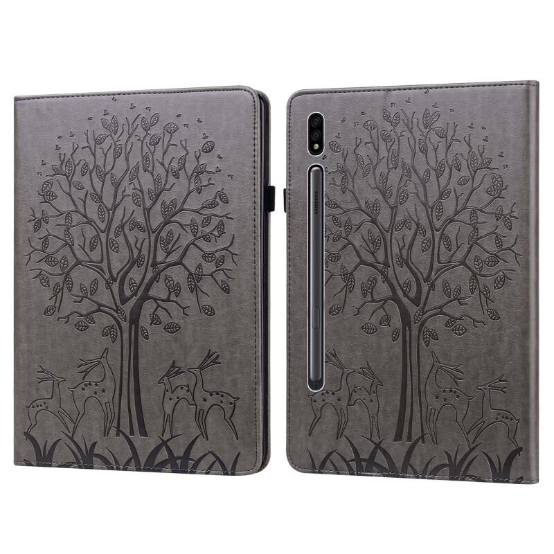 Θήκη για Samsung Galaxy Tab S8 / Galaxy Tab S7 SM-T870 με σχέδιο Δέντρου & Ελαφιού, εκτύπωση με θερμοτύπηση, οριζόντια, από δερματίνη PU με βάση & θήκες για κάρτες (Μωβ)