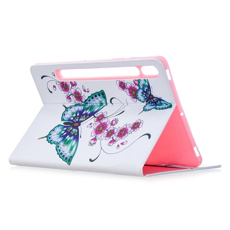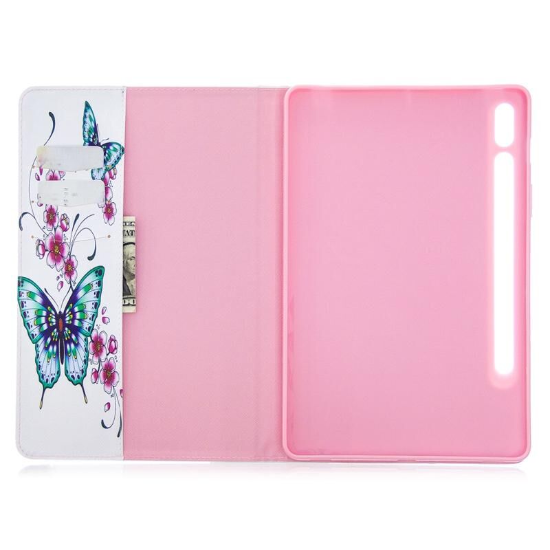 Θήκη δέρματος οριζόντιας αναδίπλωσης με σχέδιο πολύχρωμης ζωγραφικής για Samsung Galaxy Tab S8 / Galaxy Tab S7 T870 με βάση στήριξης & υποδοχές καρτών & πορτοφόλι (Πεταλούδα με άνθη ροδακινιάς)