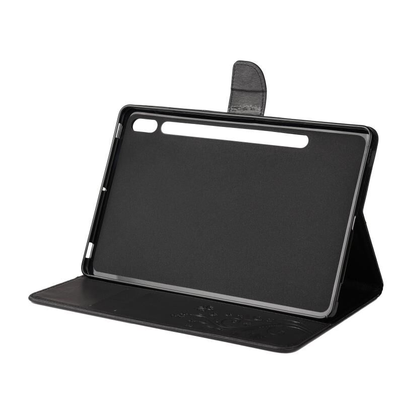 Θήκη δέρματος οριζόντιας αναδίπλωσης με σχέδιο ανάγλυφου πεταλούδας και λουλουδιών για Samsung Galaxy Tab S8 / Galaxy Tab S7 T870 / T875 με βάση & υποδοχές καρτών & πορτοφόλι (Μαύρο)