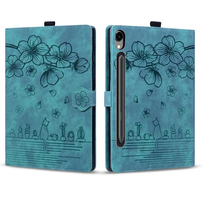 For Samsung Galaxy Tab S9 FE Cartoon Sakura Cat Embossed Leather Tablet Case(Green)
