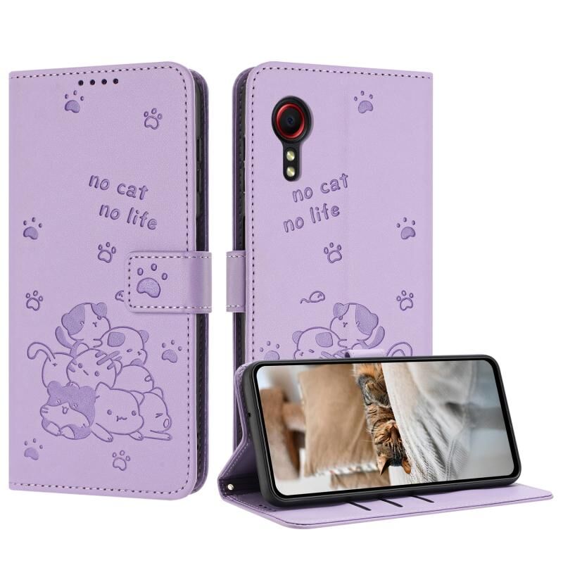 Θήκη δερμάτινη για Samsung Galaxy XCover 5 με ανάγλυφο σχέδιο γατάκι και λουρί (Μωβ)