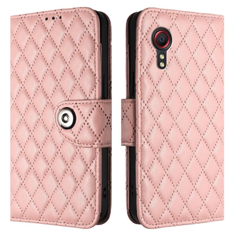 Για Samsung Galaxy Xcover 5 Rhombic υφή Flip δερμάτινη θήκη τηλεφώνου με κορδόνι (ροζ κοραλλί)