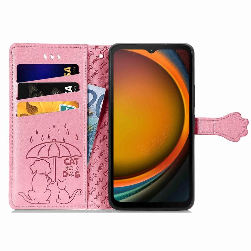 Θήκη τηλεφώνου δερμάτινη ανάγλυφη με σχέδια γάτας και σκύλου για Samsung Galaxy Xcover 7 (Κίτρινο)