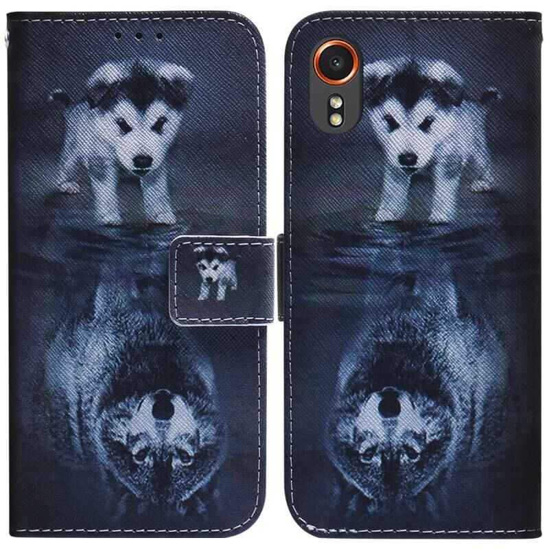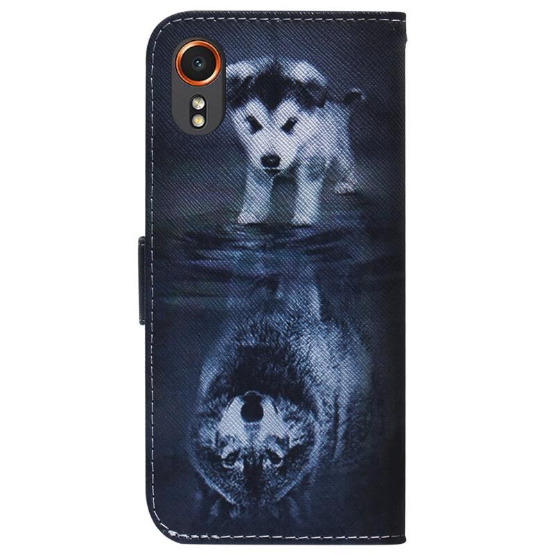 Θήκη τηλεφώνου Samsung Galaxy Xcover7 με έγχρωμο σχέδιο, δερμάτινη, τύπου flip (Λύκος και Σκύλος)