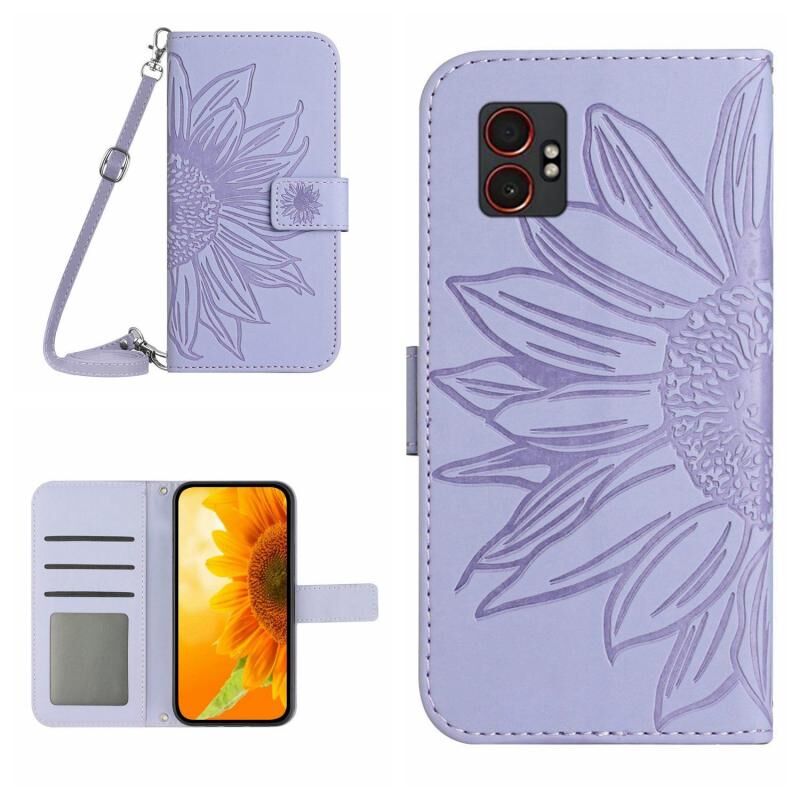 Θήκη τηλεφώνου Samsung Galaxy XCover7 Pro με δερμάτινη υφή, ανάγλυφο σχέδιο ηλίανθου και λουρί (Μωβ)