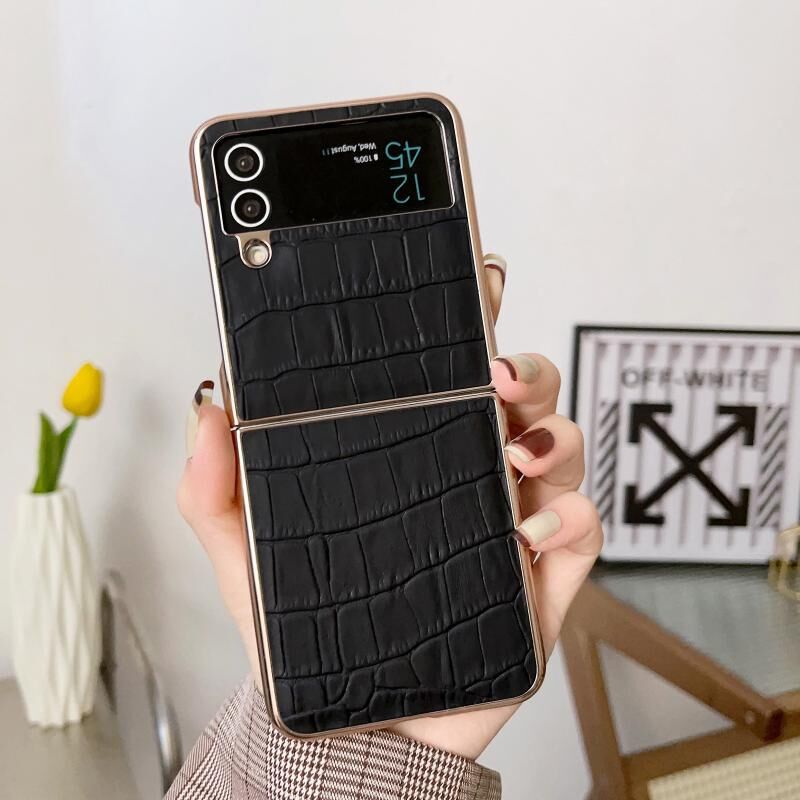 Θήκη τηλεφώνου Samsung Galaxy Z Flip4 5G με γνήσιο δέρμα υφής κροκόδειλου και ηλεκτρολυτική επίστρωση (Μαύρο)