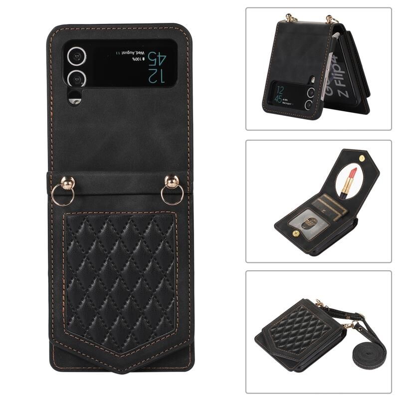 Για Samsung Galaxy Z Flip4 5G Rhombic Texture RFID θήκη τηλεφώνου με κορδόνι & καθρέφτη (Μαύρο)