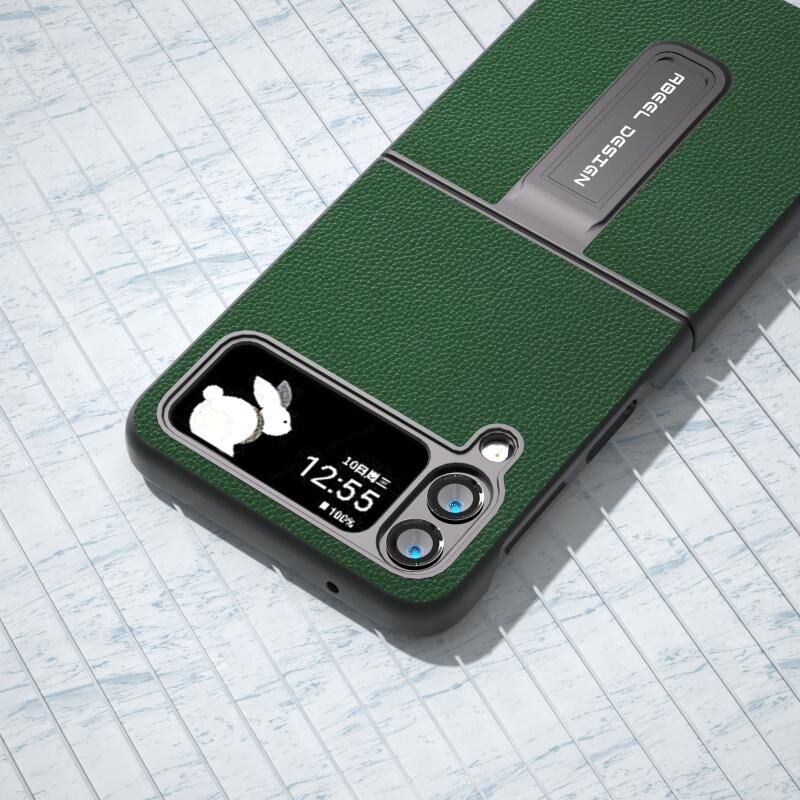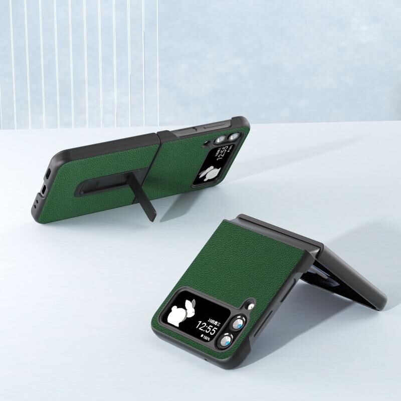 Θήκη τηλεφώνου Mino από γνήσιο δέρμα για Samsung Galaxy Z Flip4 Μαύρο Edge με βάση στήριξης (Πράσινο)