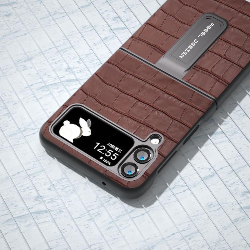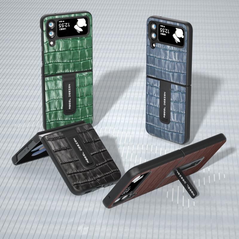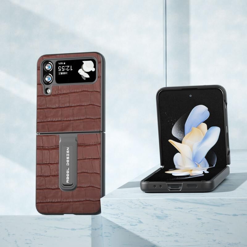 Θήκη τηλεφώνου από γνήσιο δέρμα με υφή κροκόδειλου για Samsung Galaxy Z Flip4 με βάση στήριξης (Μαύρο)
