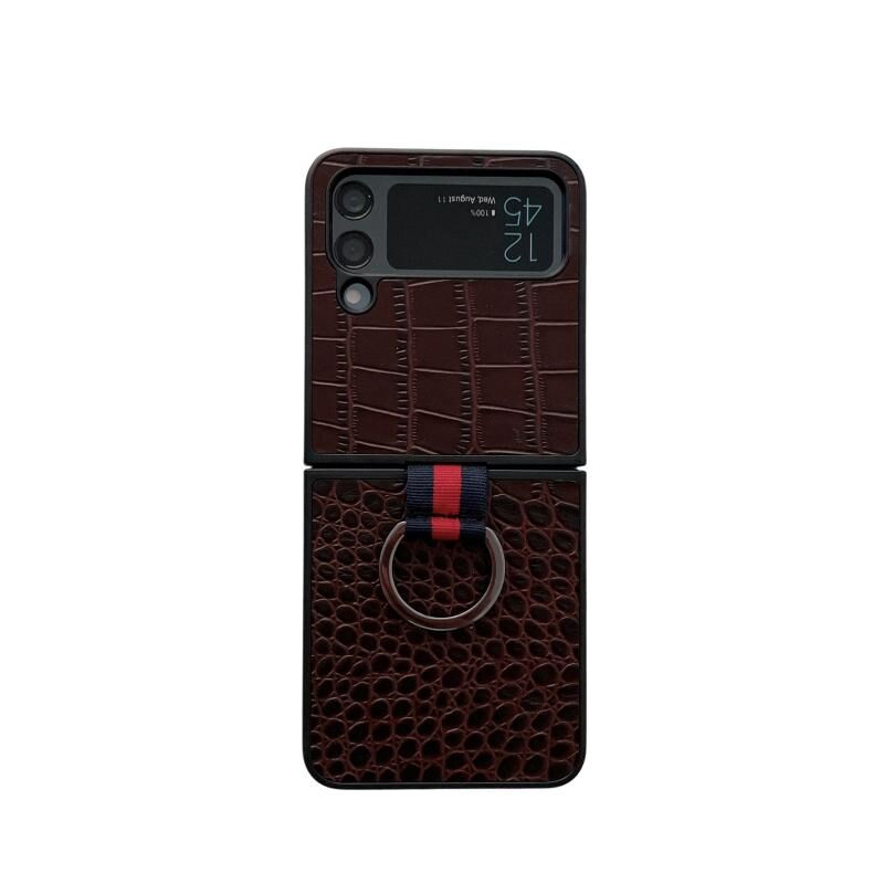 Θήκη τηλεφώνου από γνήσιο δέρμα με υφή κροκόδειλου για Samsung Galaxy Z Flip4 με δαχτυλίδι (Καφέ)