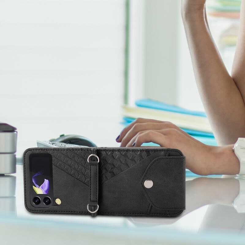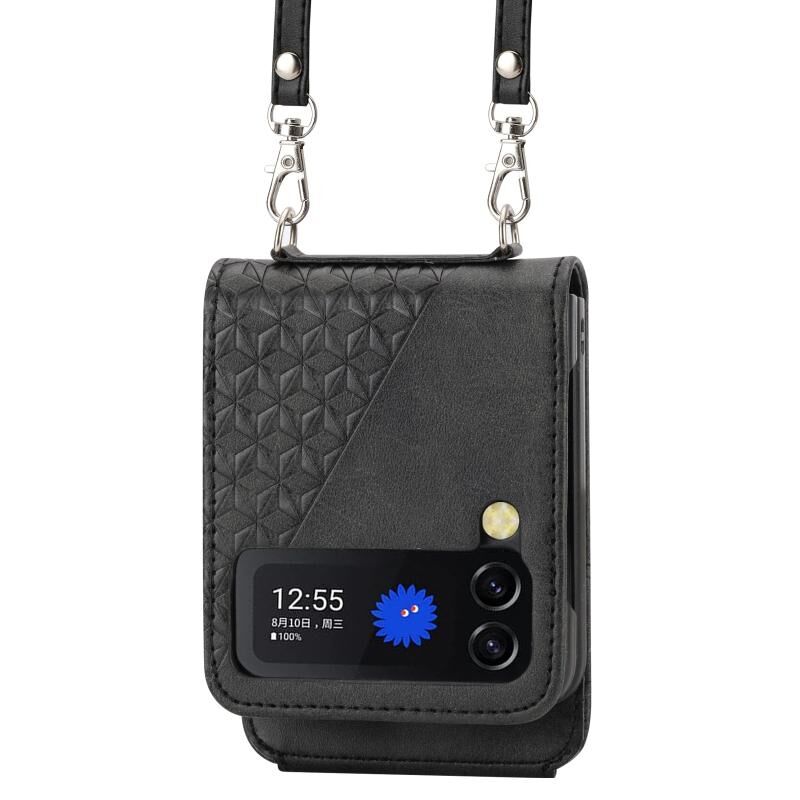 Για το Samsung Galaxy Z Flip4 Cubic Grid Calf Texture Δερμάτινη θήκη τηλεφώνου με λαιμό κορδόνι (Μαύρο)