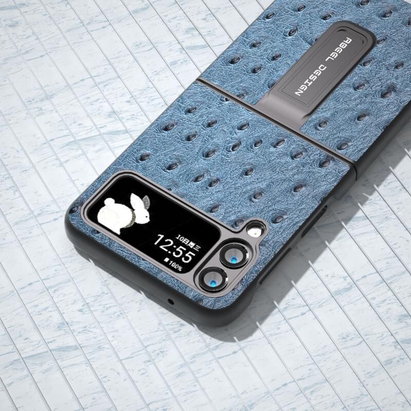 Θήκη τηλεφώνου από γνήσιο δέρμα στρουθοκάμπου για Samsung Galaxy Z Flip4 με βάση στήριξης (Πράσινο)