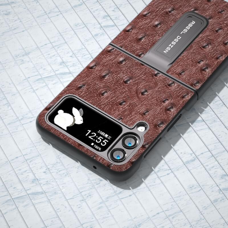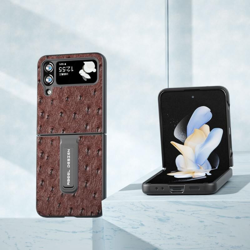 Θήκη τηλεφώνου από γνήσιο δέρμα στρουθοκάμπου για Samsung Galaxy Z Flip4 με βάση στήριξης (Καφέ)