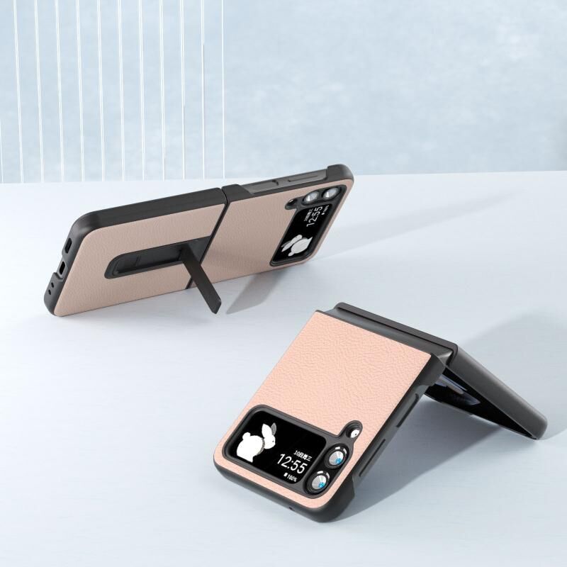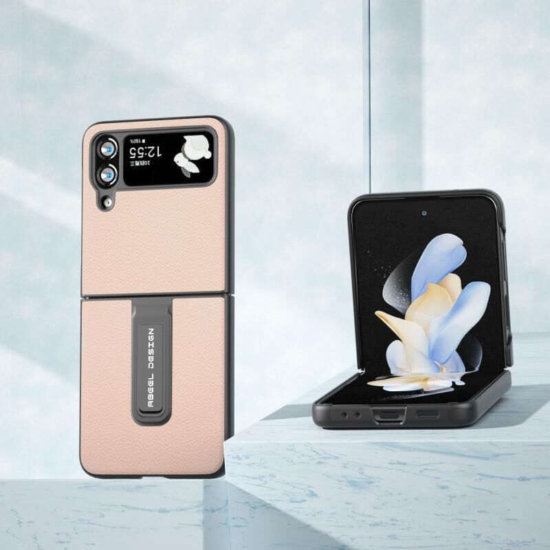Θήκη τηλεφώνου Samsung Galaxy Z Flip4 από γνήσιο δέρμα + PC με υφή Litchi και βάση στήριξης (Μπλε)