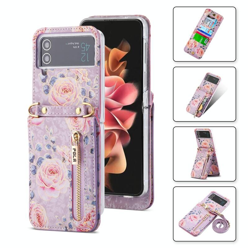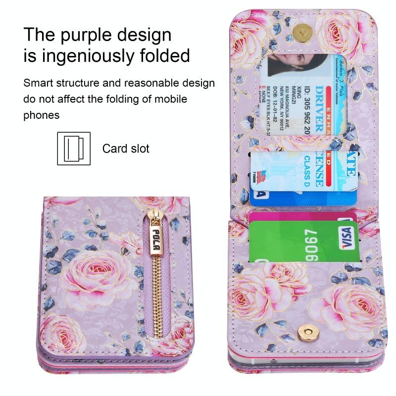 Για Samsung Galaxy Z Flip4 POLA Rose μοτίβο πολλαπλών καρτών υποδοχές φερμουάρ πορτοφόλι υπόθεση τηλεφώνου (μωβ) (POLA)