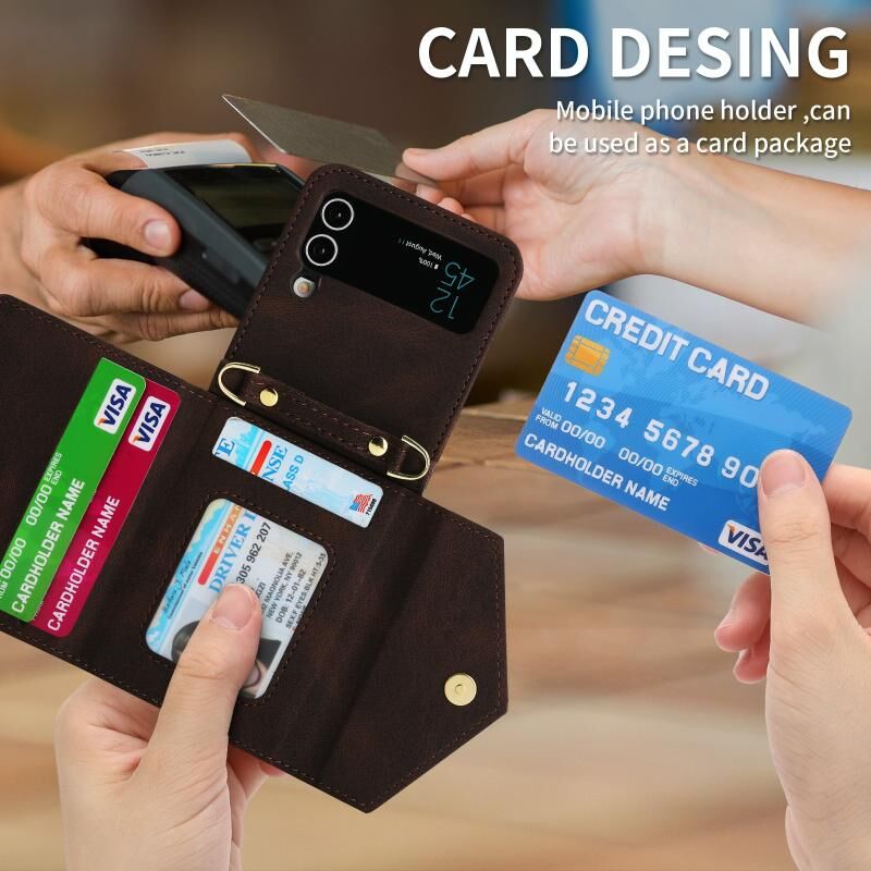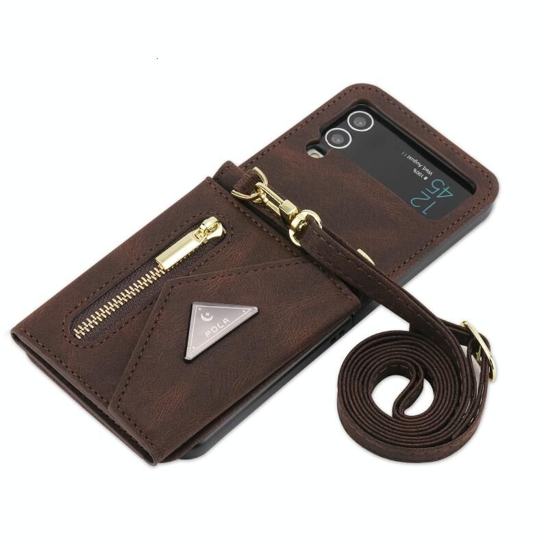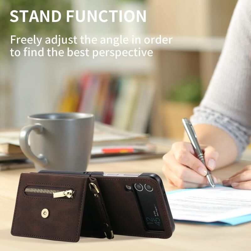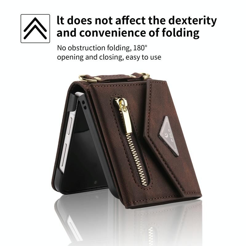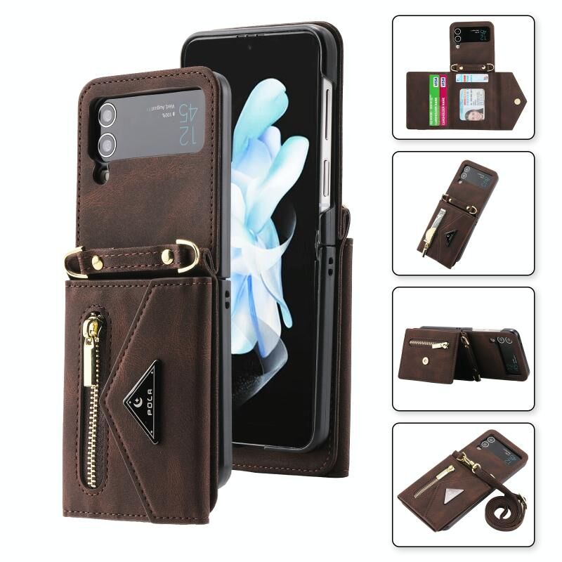 Για Samsung Galaxy Z Flip4 POLA δέρμα αίσθηση πολλαπλών καρτών υποδοχές φερμουάρ πορτοφόλι υπόθεση τηλεφώνου (καφέ) (POLA)