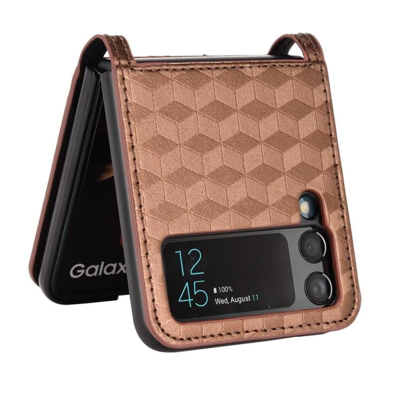 For Samsung Galaxy Z Flip4 Siamese Cubic Grid Texture Card Slot Leather Phone Case(Brown)