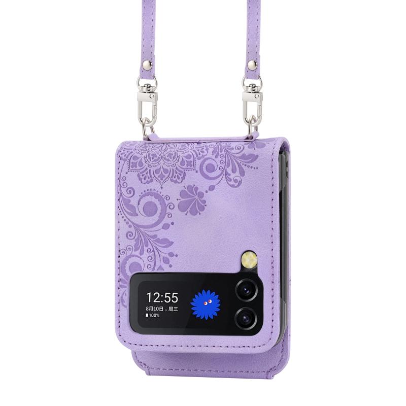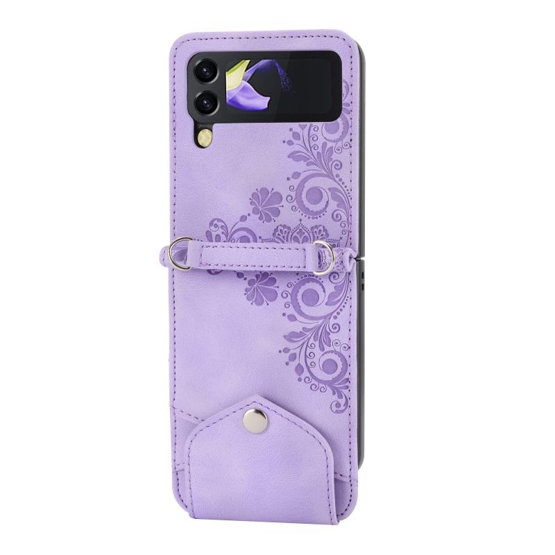 Θήκη τηλεφώνου Samsung Galaxy Z Flip4 με δερμάτινη υφή, ανάγλυφα λουλούδια και πορτοφόλι (Καφέ)