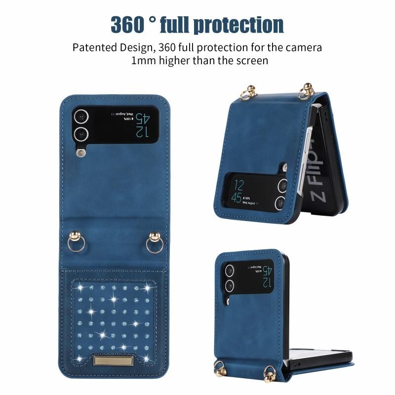 Για Samsung Galaxy Z Flip4 Τρεις-πτυχής RFID δερμάτινη θήκη τηλεφώνου με κορδόνι (μπλε)