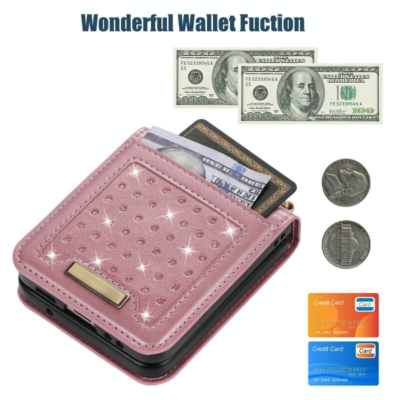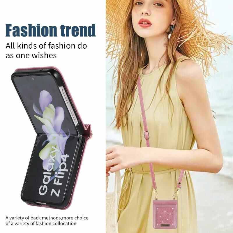 Για Samsung Galaxy Z Flip4 Τρεις-πτυχής RFID δερμάτινη θήκη τηλεφώνου με κορδόνι (ροζ χρυσό)