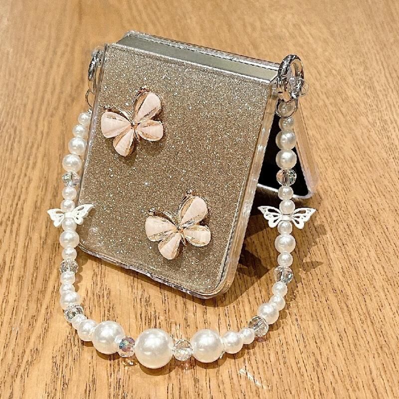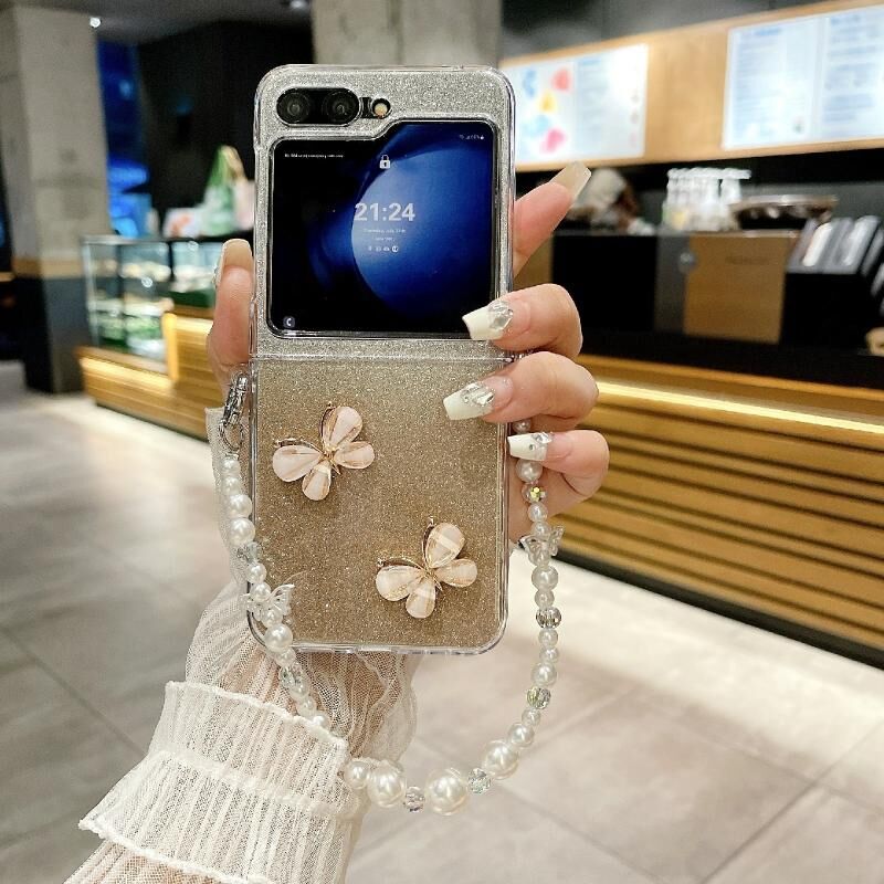 6. Η όμορφη θήκη PC με πλευρική αγκράφα διαβάθμισης glitter powder PC έχει ένα 3D μοτίβο πεταλούδας και σχεδιασμό βραχιολιού με μαργαριτάρια.