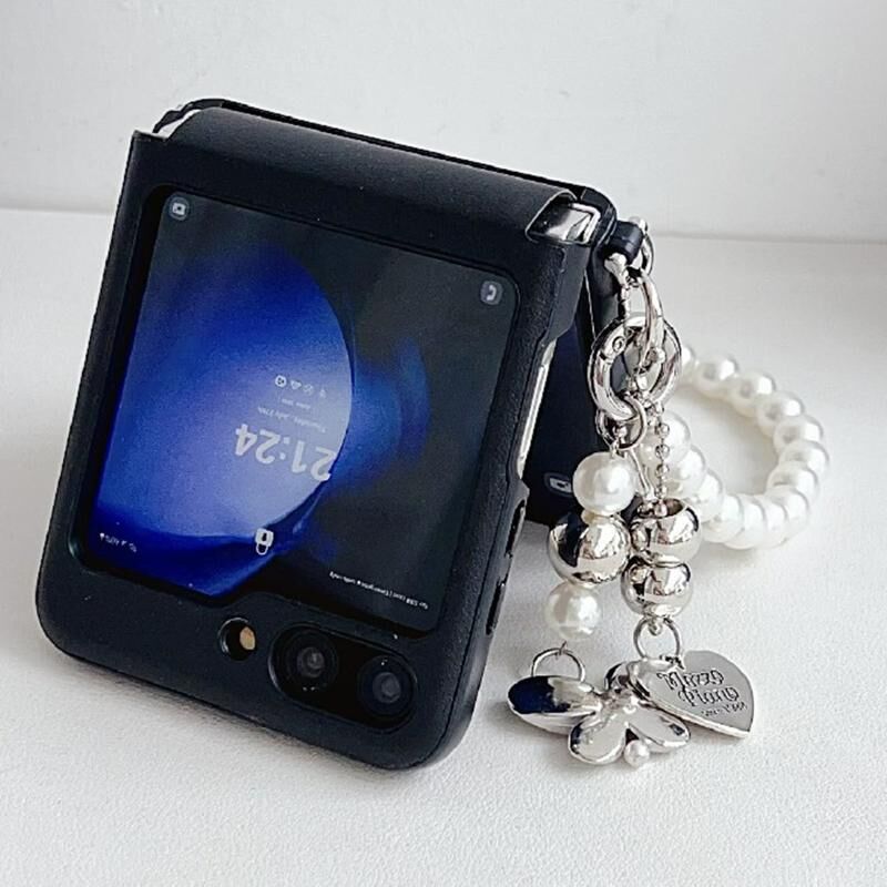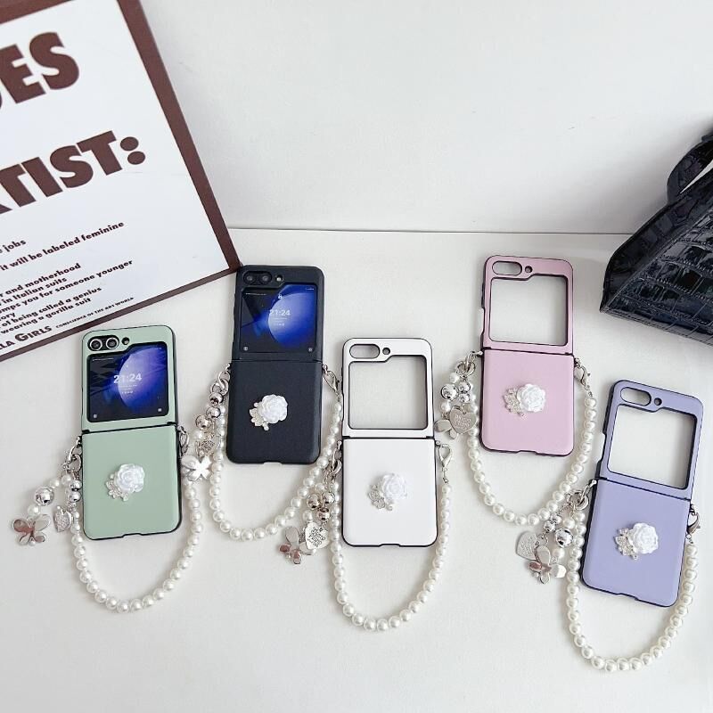 Για Samsung Galaxy Z Flip5 5G δέρμα υφή 3D Rose πλευρά πόρπη πλήρους κάλυψης Shockproof τηλέφωνο υπόθεση με μαργαριτάρι βραχιόλι (Μαύρο)