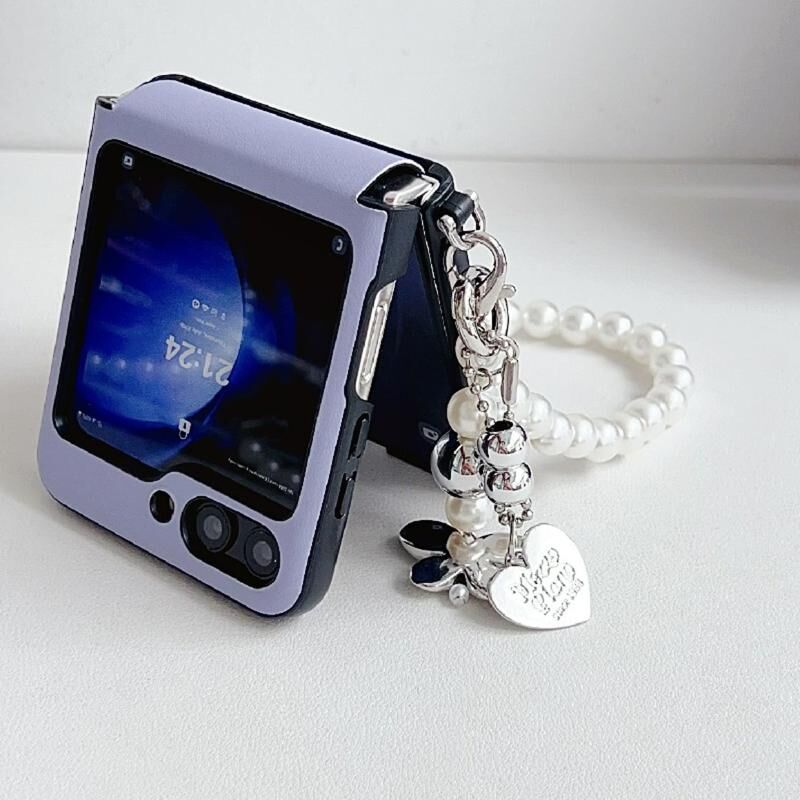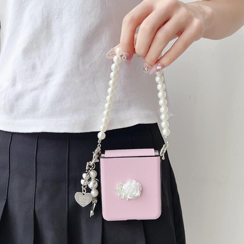 6. Η όμορφη δερμάτινη θήκη με υφή αγκράφας στο πλάι έχει ένα 3D μοτίβο τριαντάφυλλου και σχέδιο βραχιολιού με μαργαριτάρια.