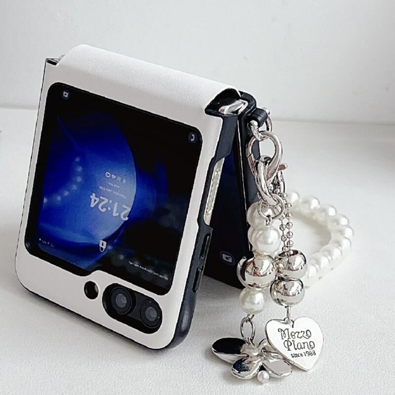 6. Η όμορφη δερμάτινη θήκη με υφή αγκράφας στο πλάι έχει ένα 3D μοτίβο τριαντάφυλλου και σχέδιο βραχιολιού με μαργαριτάρια.