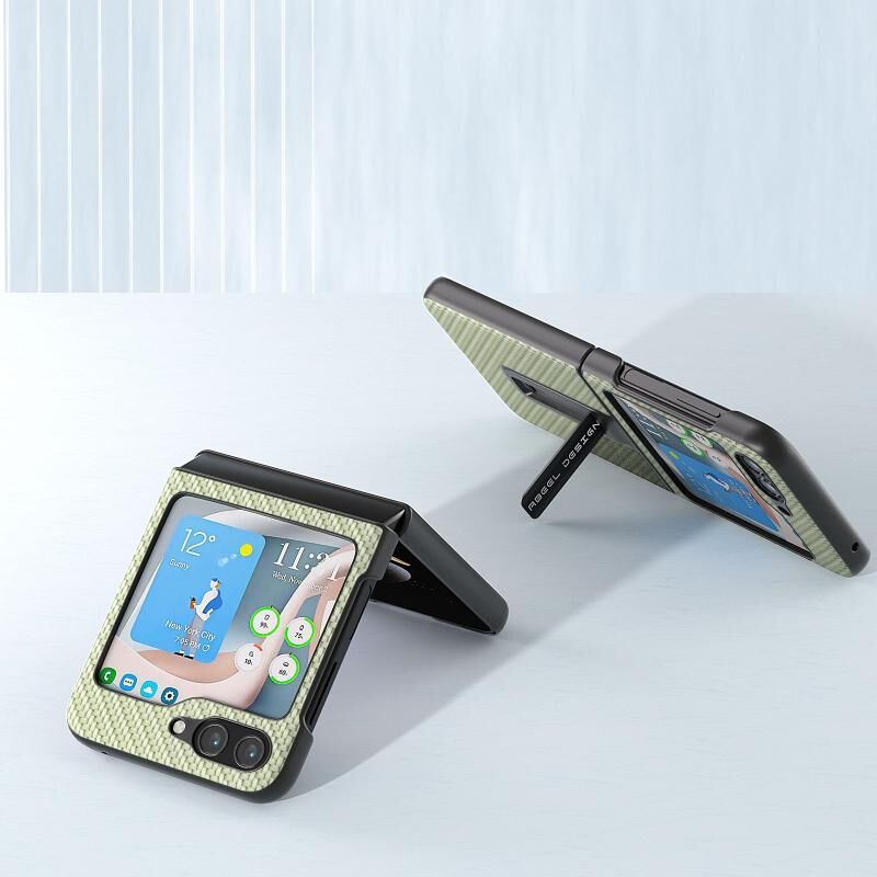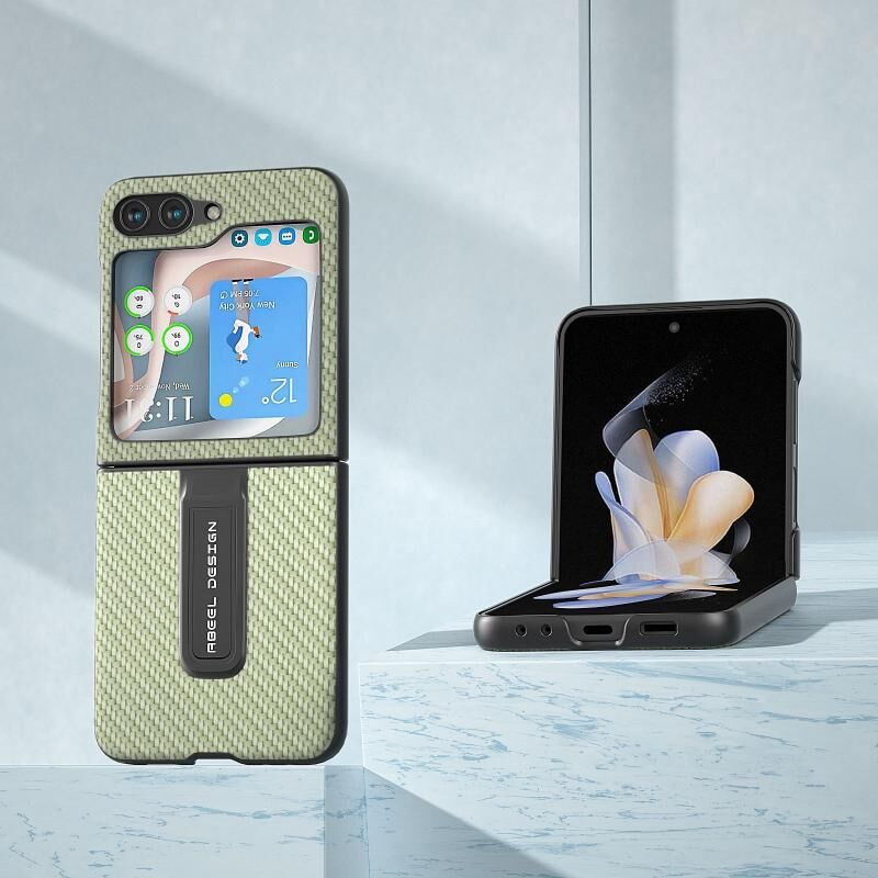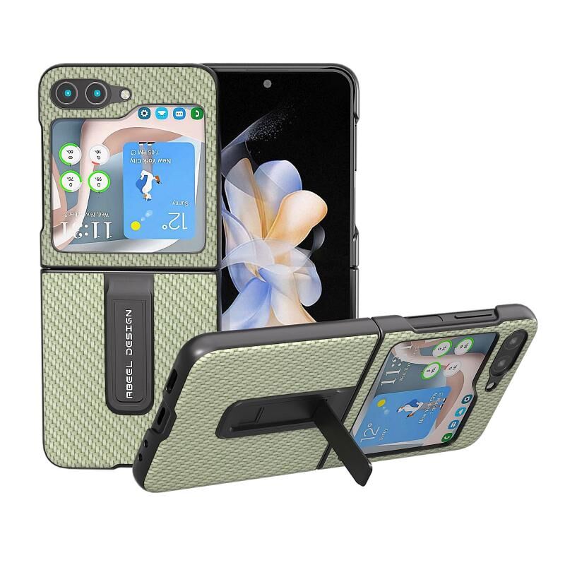 Θήκη προστασίας κινητού τηλεφώνου με υφή ανθρακονήματος για Samsung Galaxy Z Flip5 ABEEL με βάση στήριξης (Πράσινο)