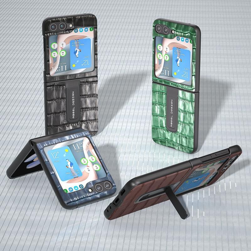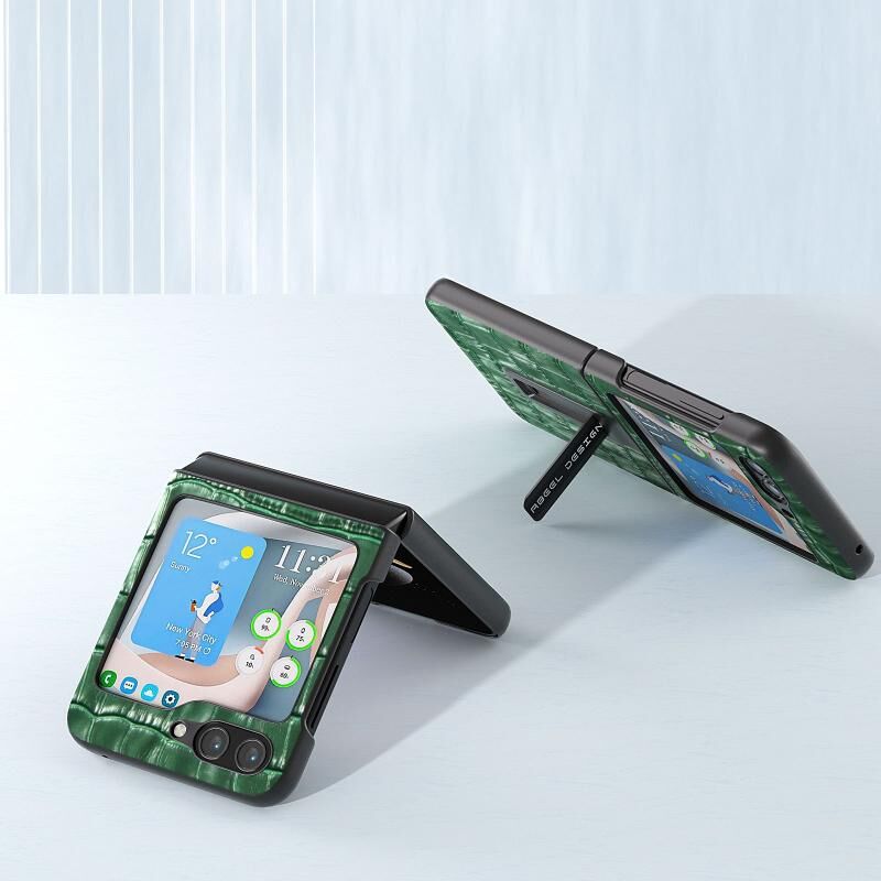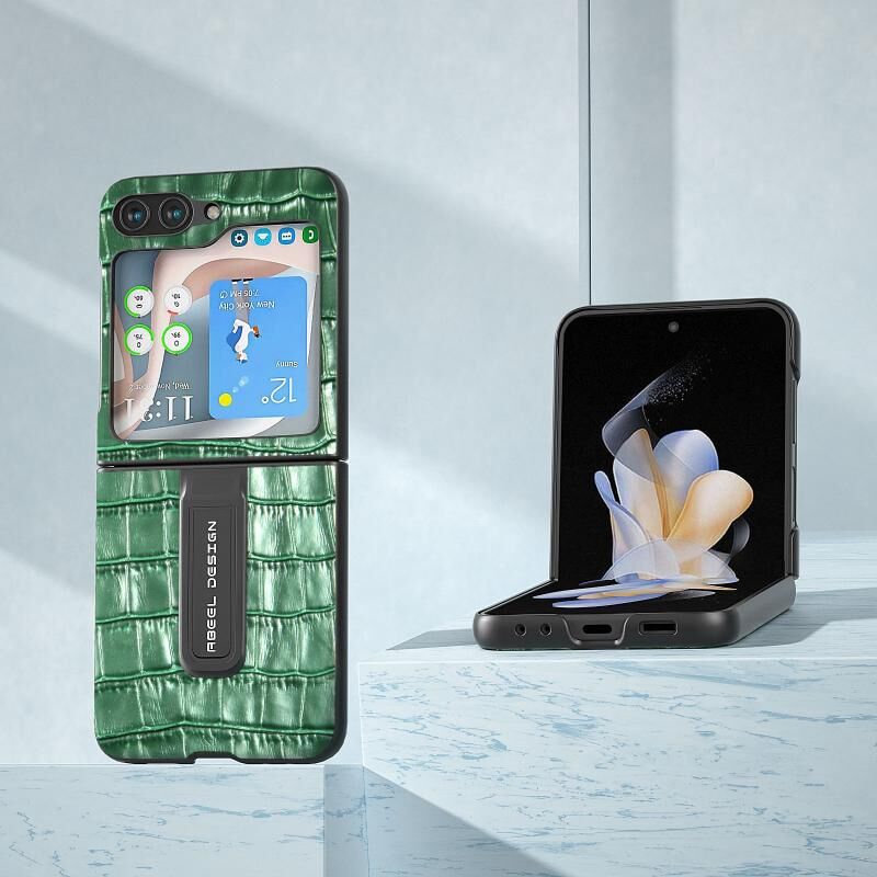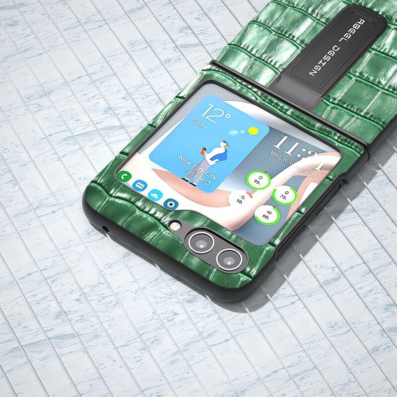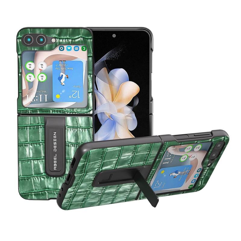 Θήκη τηλεφώνου από γνήσιο δέρμα με υφή κροκόδειλου για Samsung Galaxy Z Flip5 ABEEL με βάση στήριξης (Πράσινο)