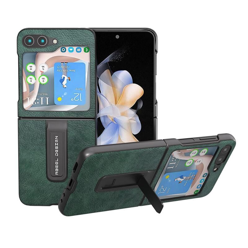 Θήκη τηλεφώνου για Samsung Galaxy Z Flip5 ABEEL Διχρωμίας με Υφή Lichi από PU με Στήριξη (Μαύρο)