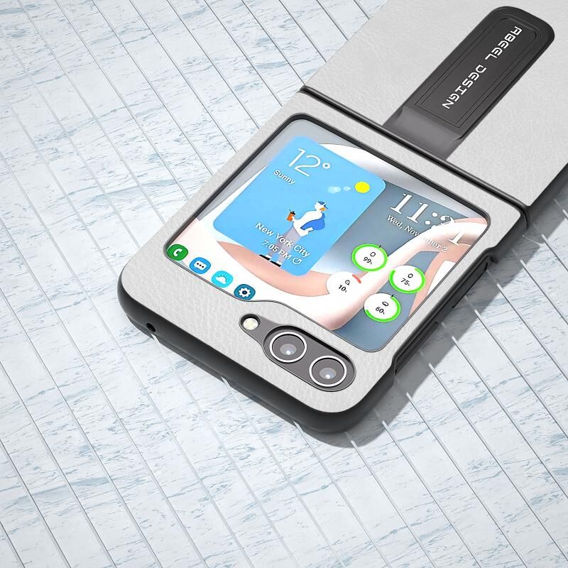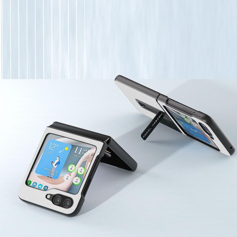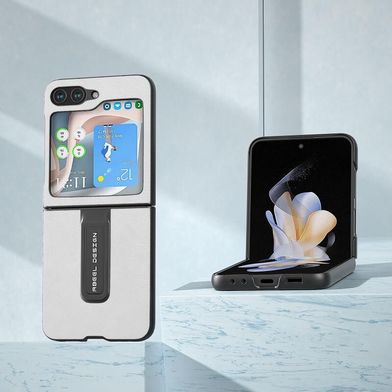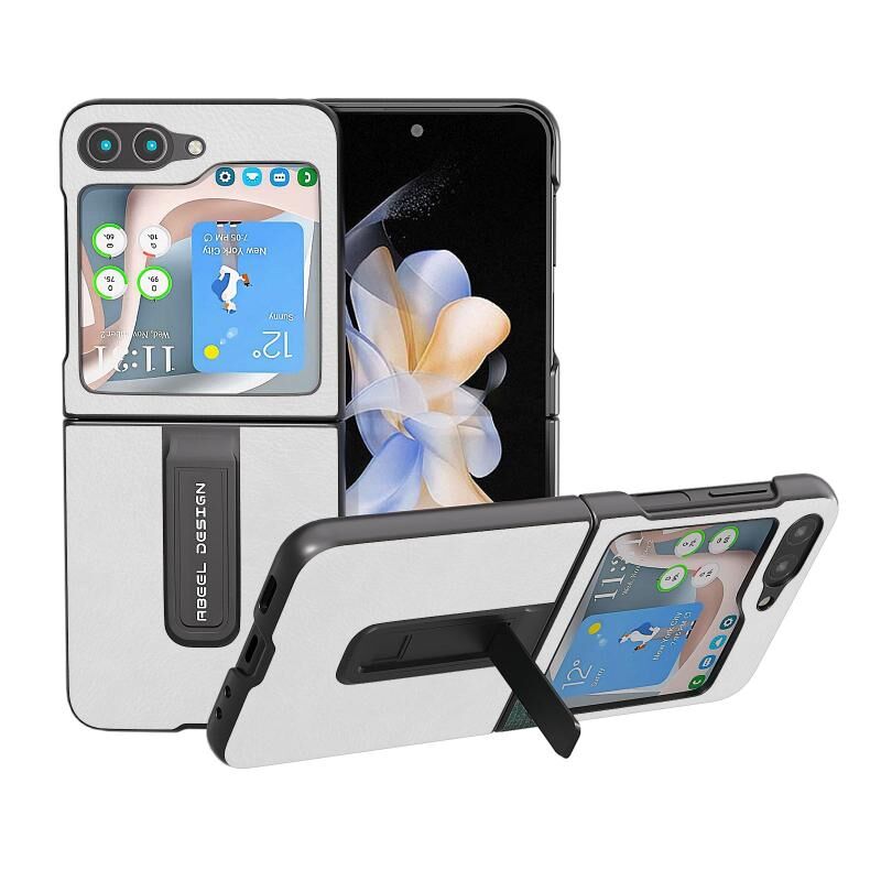 Θήκη τηλεφώνου για Samsung Galaxy Z Flip5 ABEEL Διχρωμίας με Υφή Lichi από PU με Στήριξη (Μαύρο)