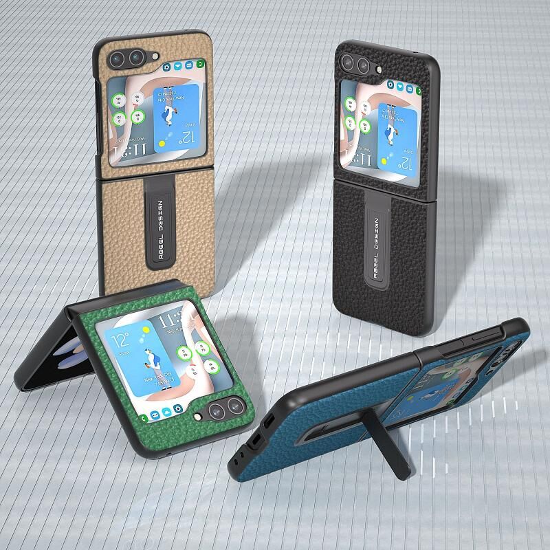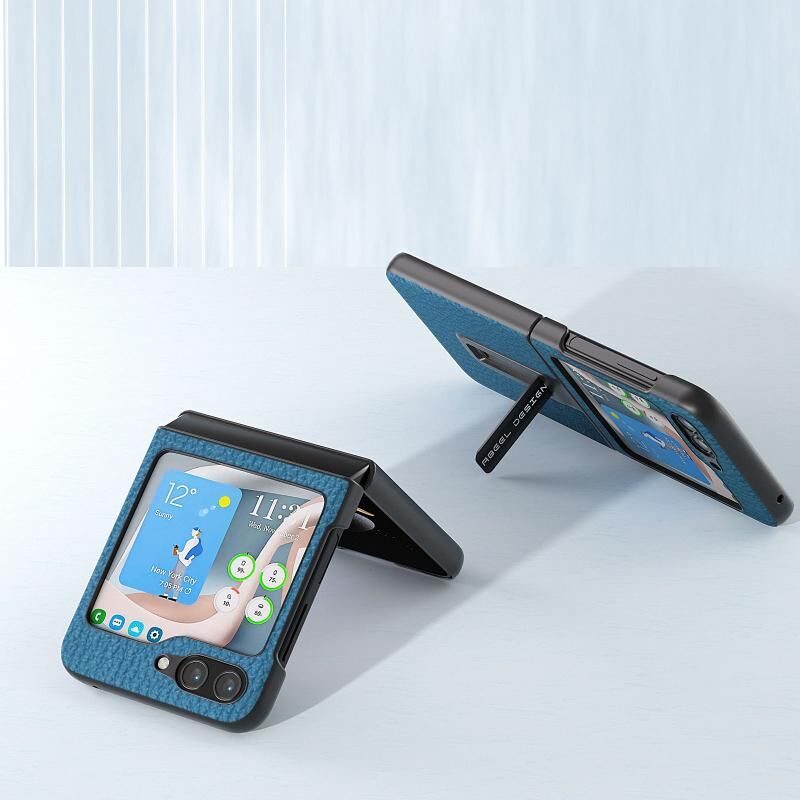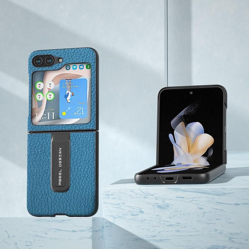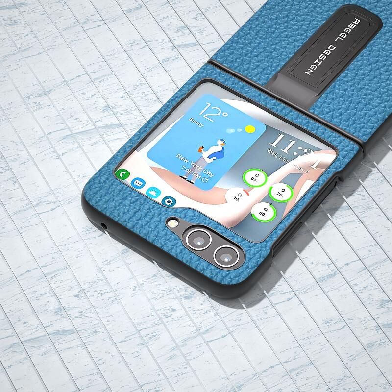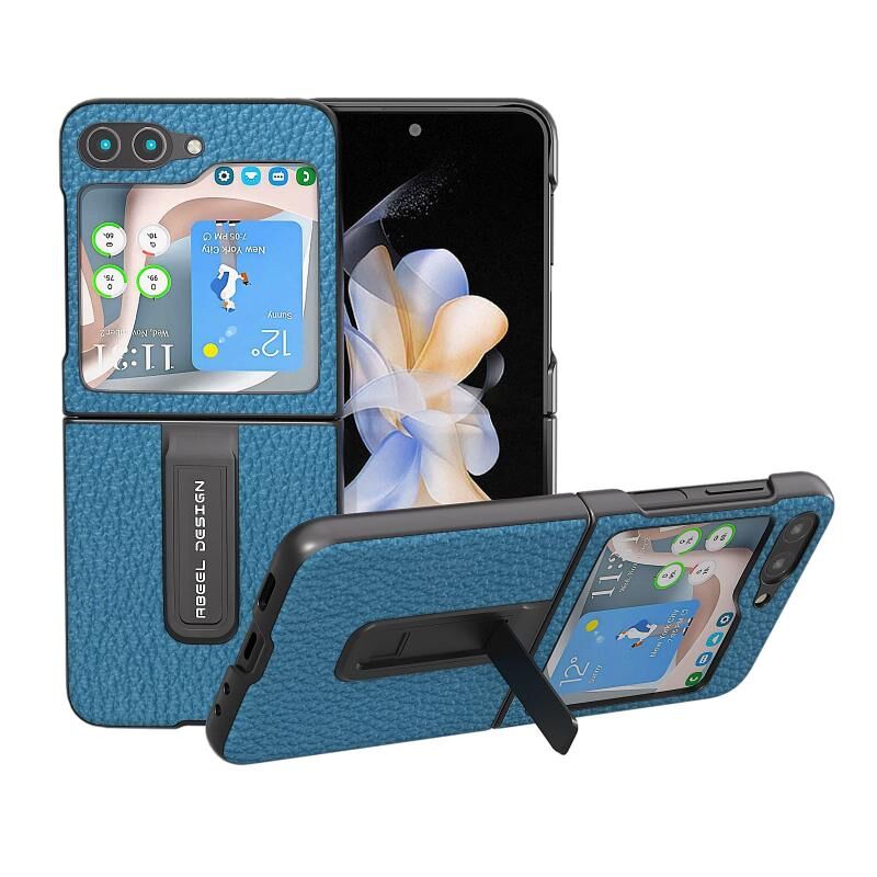 Θήκη τηλεφώνου από γνήσιο δέρμα ABEEL με υφή λυτσί για Samsung Galaxy Z Flip5 με βάση στήριξης (Μπλε)