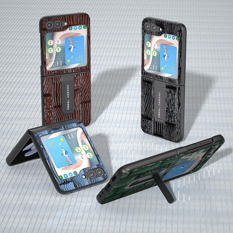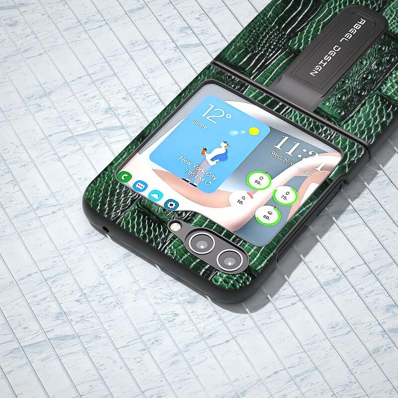 Θήκη τηλεφώνου Samsung Galaxy Z Flip5 ABEEL από γνήσιο δέρμα, σειρά Mahjong με υφή, με βάση στήριξης (Μαύρο)