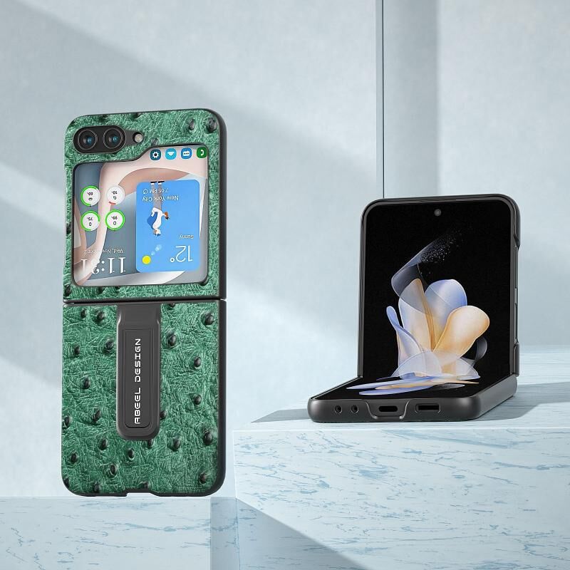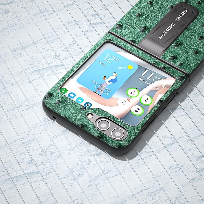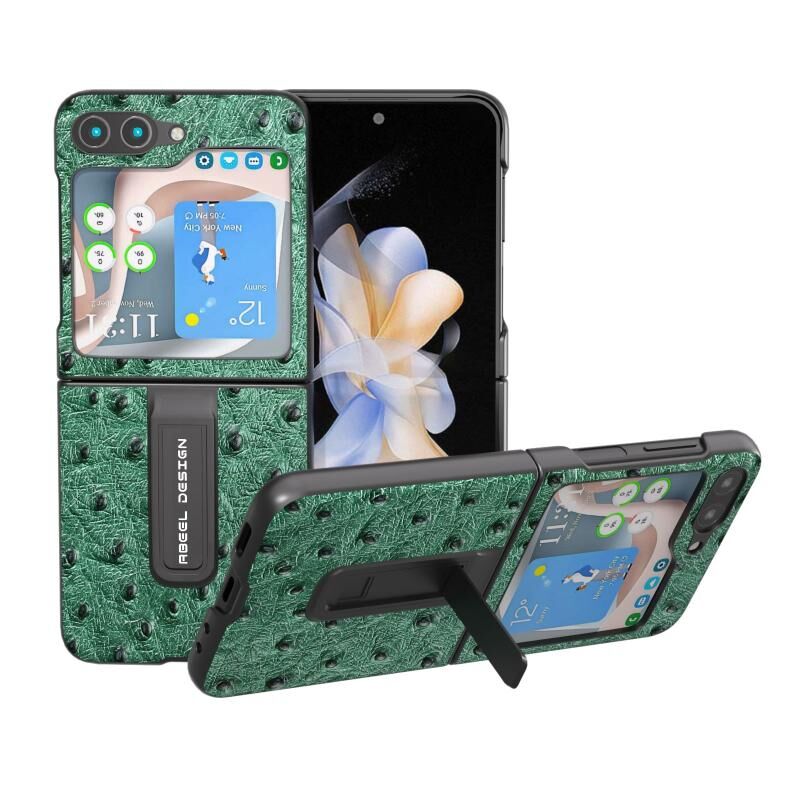 Θήκη τηλεφώνου από γνήσιο δέρμα στρουθοκάμπου με υφή για Samsung Galaxy Z Flip5 ABEEL με βάση στήριξης (Πράσινο)