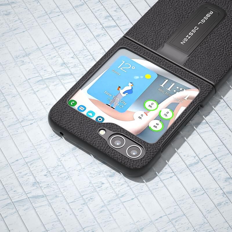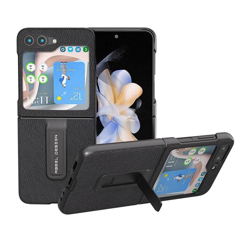 Θήκη τηλεφώνου Samsung Galaxy Z Flip5 ABEEL από γνήσιο δέρμα + PC με υφή λυτσί (Χρυσό Ροζ) με βάση στήριξης.